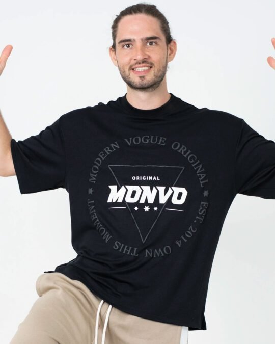 premium cotton single jersey for ultimate comfort and breathability. Featuring a puff print graphic with a shining MONVO logo, this tee blends street style with a touch of modern edge. The oversized fit, ribbed neckband, and side slits ensure a relaxed yet stylish shape.Perfect for effort less everyday wear.